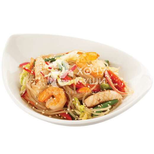 Состав: креветка, кальмар, стеклянная лапша, соус Пад Тай, овощной микс, чеснок, имбирь, кунжут