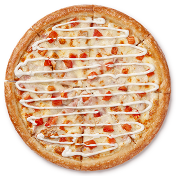 Размер 33 см. Соус Рэнч, ветчина, сыр моцарелла, цыпленок, свежие томаты, соус Рэнч